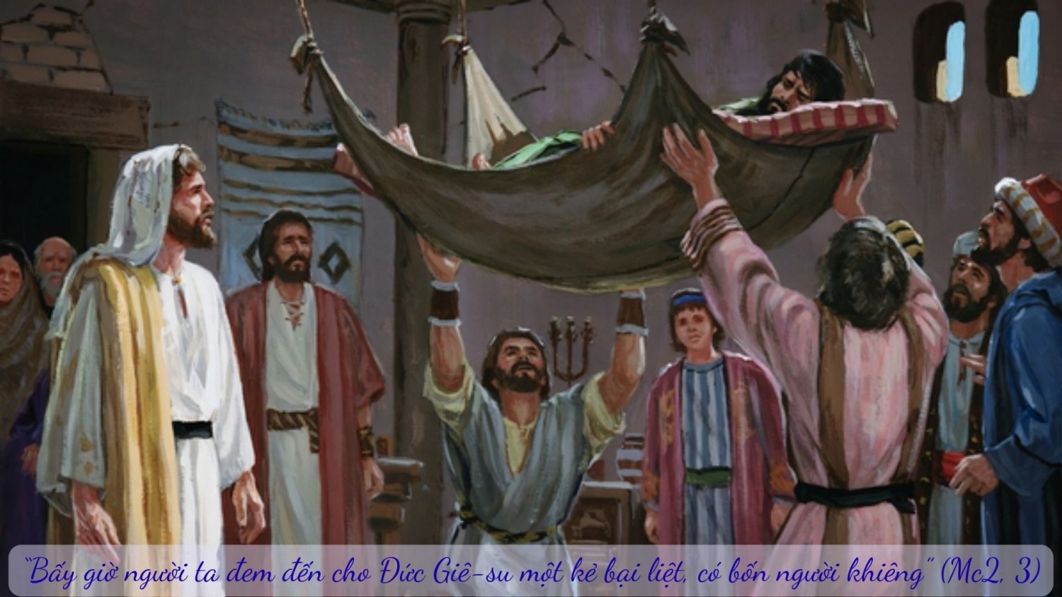 Sau khi Chúa Giê-su chữa lành cho một người mắc bệnh phong hủi, có lẽ Chúa Giê-su đã ẩn thân nghỉ ngơi vài ngày và hôm nay Người trở lại Ca-phác-na-um. “Hay tin Người ở nhà, dân chúng tụ tập lại, đông đến nỗi trong nhà ngoài sân chứa không hết. Người giảng lời cho họ.” (Mc 2,1-2)