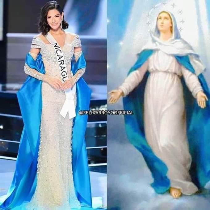 Sau khi cô hoa hậu Sheynnis đăng quang, nhiều trang mạng mang tên Công Giáo đã lấy hình cô hoa hậu mặc váy dạ hội đối chiếu với Mẹ Maria mặc áo khoác màu xanh để nói rằng “chiếc váy này lấy cảm hứng từ áo choàng của Mẹ Maria”, và chạy dòng tiêu đề rằng:  “Vương Niệm là của Chúa”.