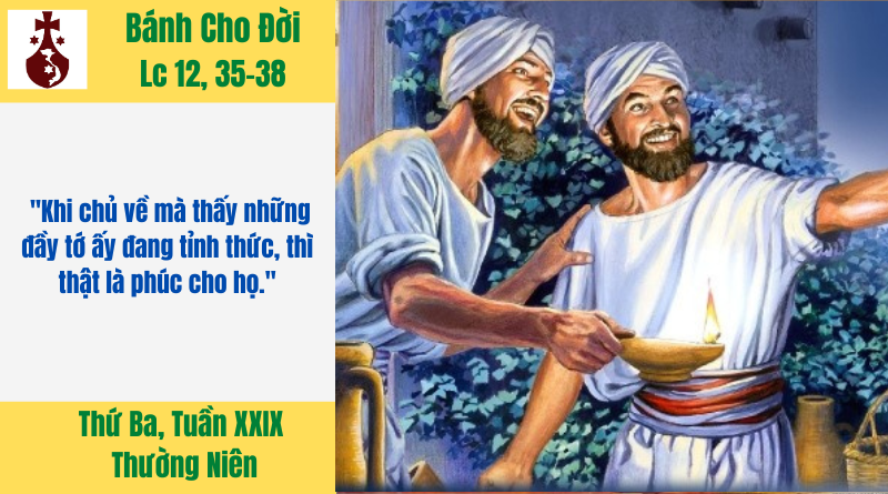 Tin Mừng hôm nay, Chúa mời gọi ta đi vào một trong những nếp sống thường nhật của người Do Thái để khám phá lại cái thái độ tỉnh thức cần có của chúng ta. Thái độ đợi Chúa đến trong cuộc đời mỗi người. Thái độ này được biểu hiện trong khung cảnh của những người đầy tớ đợi chủ đi dự tiệc cưới về.