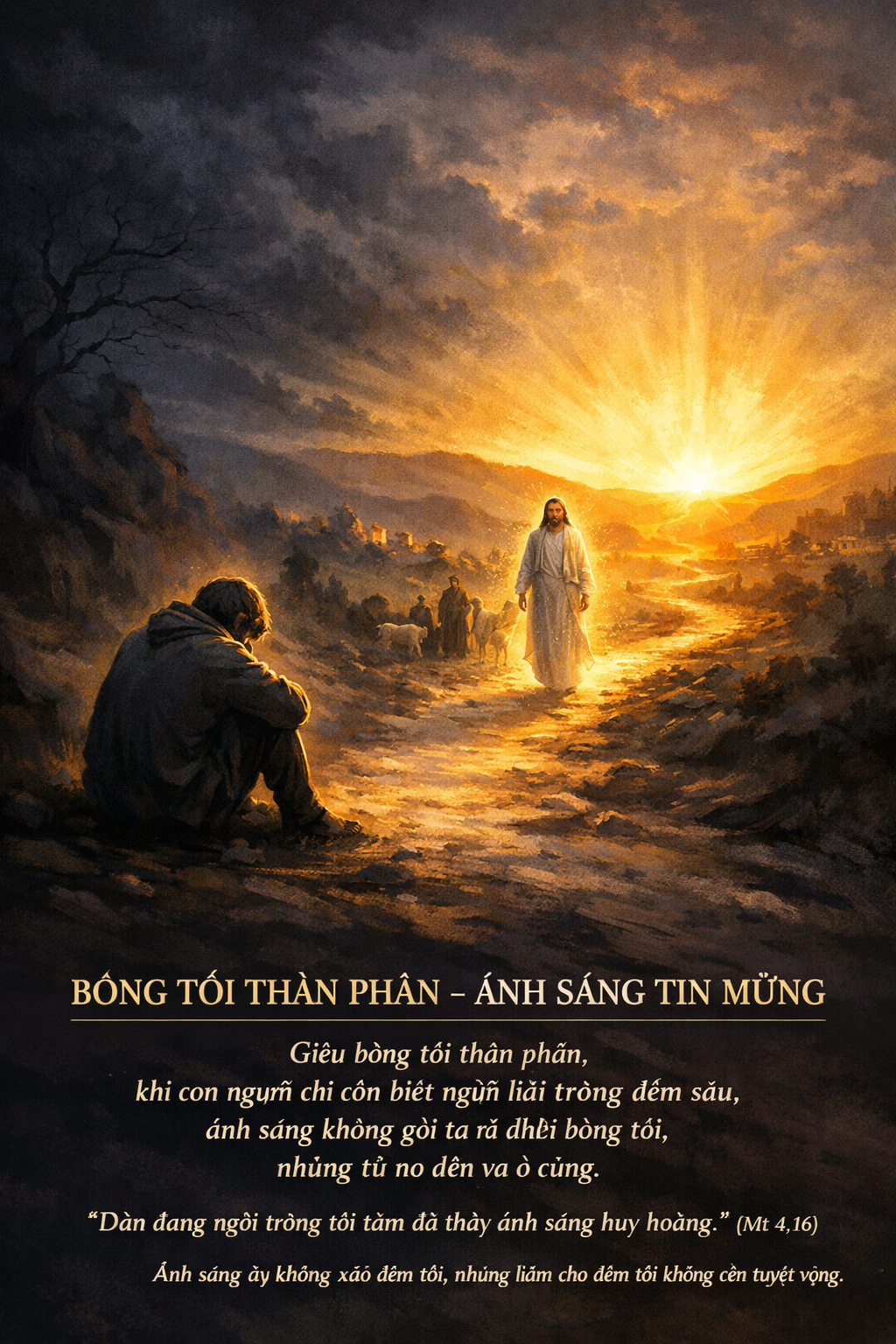 Bóng tối mà Tin Mừng nói đến không chỉ là bóng tối của hoàn cảnh hay lịch sử, mà là bóng tối thân phận. Đó là kinh nghiệm chung của con người: hữu hạn, mong manh, dễ tổn thương, và nhiều khi lạc lối ngay trong chính đời mình. Có những bóng tối không do tội lỗi rõ ràng, nhưng do thân phận làm người: sinh ra trong giới hạn, lớn lên giữa bất toàn, và bước đi dưới bóng của cái chết.