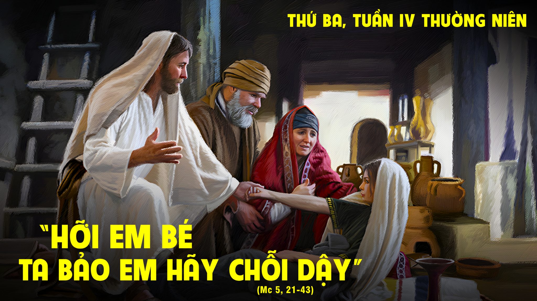 35Đức Giê-su còn đang nói, thì có mấy người từ nhà ông trưởng hội đường đến bảo: “Con gái ông chết rồi, làm phiền Thầy chi nữa?”. 36Nhưng Đức Giê-su nghe được câu nói đó, liền bảo ông trưởng hội đường: “Ông đừng sợ, chỉ cần tin thôi”. 37Rồi Người không cho ai đi theo mình, trừ ông Phê-rô, ông Gia-cô-bê và em ông này là ông Gio-an. 38Các ngài đến nhà ông trưởng hội đường. Đức Giê-su thấy người ta khóc lóc, kêu la ầm ĩ. 39Người bước vào nhà và bảo họ: “Sao lại náo động và khóc lóc như vậy? Đứa bé có chết đâu, nó ngủ đấy!”. 40Họ chế nhạo Người. Nhưng Người bắt họ ra ngoài hết, rồi dẫn cha mẹ đứa trẻ và những kẻ cùng đi với Người, vào nơi nó đang nằm. 41Người cầm lấy tay nó và nói: “Ta-li-tha kum”, nghĩa là: “Này bé, Thầy truyền cho con: trỗi dậy đi!”. 42Lập tức con bé đứng dậy và đi lại được, vì nó đã mười hai tuổi. Và lập tức, người ta kinh ngạc sững sờ. 43Đức Giê-su nghiêm cấm họ không được để một ai biết việc ấy, và bảo họ cho con bé ăn.