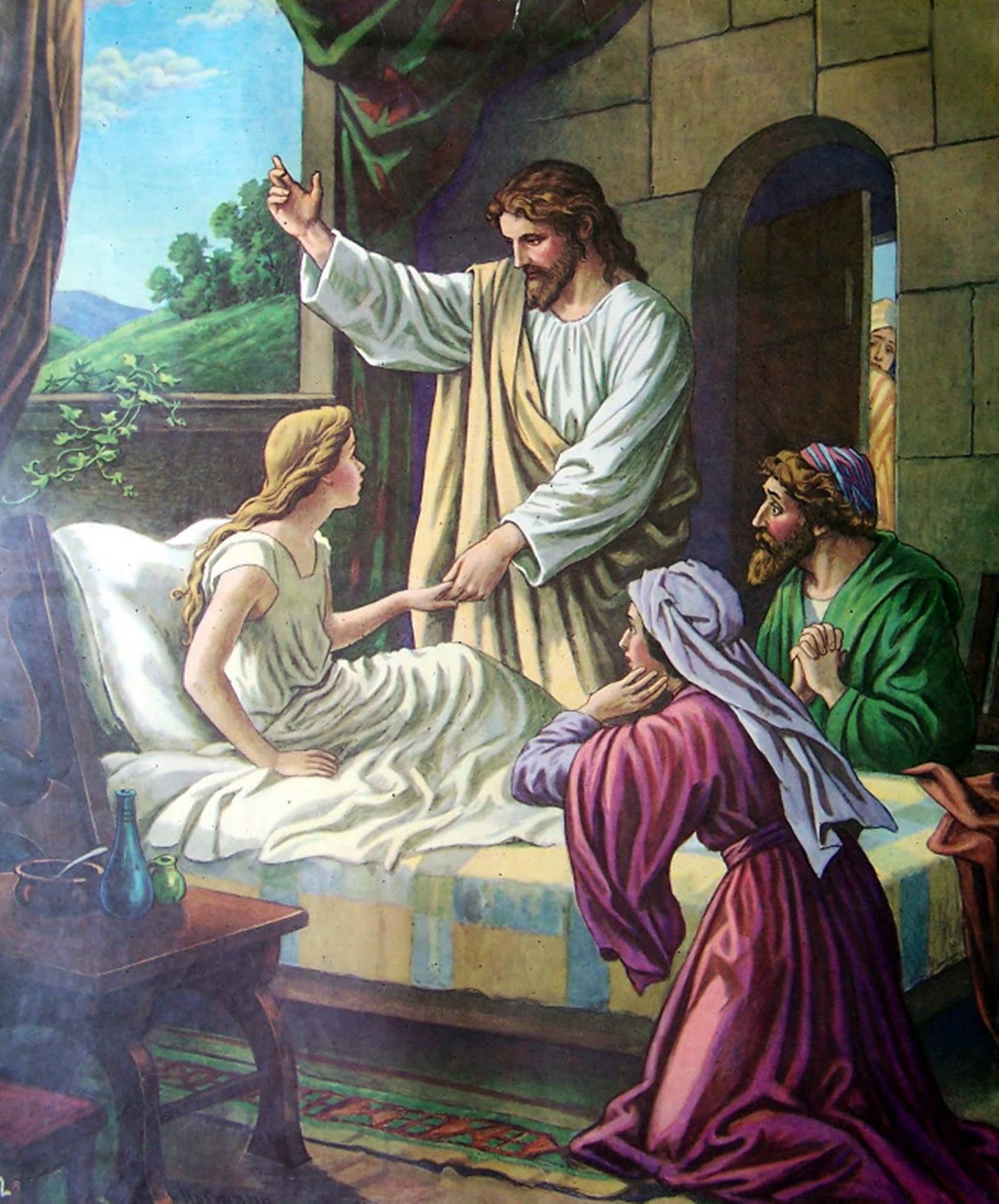 Người còn đang nói, thì người nhà đến nói với ông trưởng hội đường rằng: “Con gái ông chết rồi, còn phiền Thầy làm chi nữa?” Nhưng Chúa Giêsu đã thoáng nghe lời họ vừa nói, nên Người bảo ông trưởng hội đường rằng: “Ông đừng sợ, hãy cứ tin”. Và Người không cho ai đi theo, trừ Phêrô, Giacôbê và Gioan, em Giacôbê. Các ngài đến nhà ông trưởng hội đường. Và Chúa Giêsu thấy người ta khóc lóc kêu la ồn ào, Người bước vào và bảo họ: “Sao ồn ào và khóc lóc thế? Con bé không chết đâu, nó đang ngủ đó”. Họ liền chế diễu Người. Nhưng Người đuổi họ ra ngoài hết, chỉ đem theo cha mẹ đứa bé và những môn đệ đã theo Người vào chỗ đứa bé nằm. Và Người cầm tay đứa nhỏ nói rằng: “Talitha, Koumi!”, nghĩa là: “Hỡi em bé, Ta truyền cho em hãy chỗi dậy!” Tức thì em bé đứng dậy và đi được ngay, vì em đã được mười hai tuổi. Họ sửng sốt kinh ngạc. Nhưng Người cấm ngặt họ đừng cho ai biết việc ấy, và bảo họ cho em bé ăn.