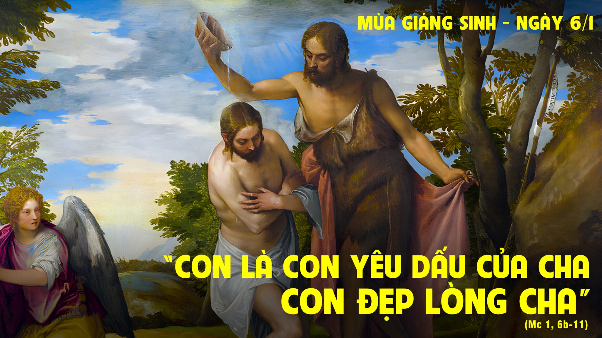 Trang Tin mừng hôm nay trình bày hai lời chứng sống động và đầy thế giá về Chúa Giêsu Kitô và phép rửa liên quan đến Người. Một là lời chứng của Gioan Tẩy Giả và một của chính Chúa Cha qua tiếng từ trời tuyên phán. Trước hết, đó là lời chứng của Gioan về một Đấng quyền thế hơn ông: “Đấng sẽ làm phép rửa cho anh em trong Thánh Thần”. Hẳn là Gioan, dù trong tương quan anh em bà con với Chúa, cũng không thể hiểu một lần cho tất cả về những gì ông đang loan báo, nhất là sự cao trọng của phép rửa trong Thánh Thần từ Chúa Giêsu là như thế nào. Bằng chứng là khi bị bắt ngồi tù, do ông can đảm tố cáo sự sai trái của vua Hêrôđê vốn đã lấy vợ của anh vua, thì ông đã sai môn đệ đến hỏi Chúa Giêsu về tư cách và sứ mệnh đích thực của Người, khi nghe thấy những gì Chúa đã làm: “Thầy có phải là Đấng phải đến hay chúng tôi còn phải chờ một ai khác?” (Mt 11,3). Như vậy, làm sao Gioan đã loan báo và dám trả giá bằng chính cả mạng sống cho một lời chứng cao quý về Đấng quyền thế hơn ông, Đấng mà ông “không đáng cúi xuống để cởi quai dép cho Người”? Phải chăng đã có một nền tảng căn bản hơn nơi lời chứng thứ hai, khi ông được lắng nghe và đã giúp ông củng cố niềm tin của mình. Đó là lời chứng của chính Chúa Cha về Chúa Giêsu, một tương quan Cha-Con thân thiết: “Con là Con yêu dấu của Cha, Cha hài lòng về Con”. Quả thật, chính Đấng ấy đã luôn luôn “làm đẹp lòng Cha”.