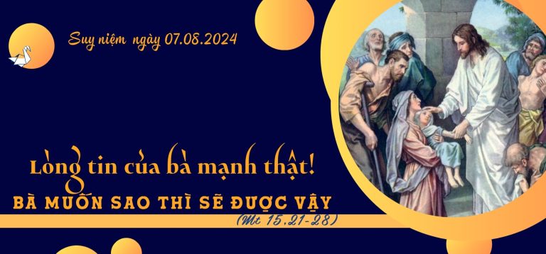 Lạy Chúa Giêsu, tình yêu và lòng thương xót của Chúa không bờ bến. Chớ gì con luôn luôn tin tưởng và chạy đến Chúa với sự kiên trì bất khuất như người đàn bà ngoại giáo đã làm. Xin gia tăng lòng tin của con trong sức mạnh giải thoát của Chúa, và xin cứu con thoát khỏi mọi sự dữ và hiểm nguy.